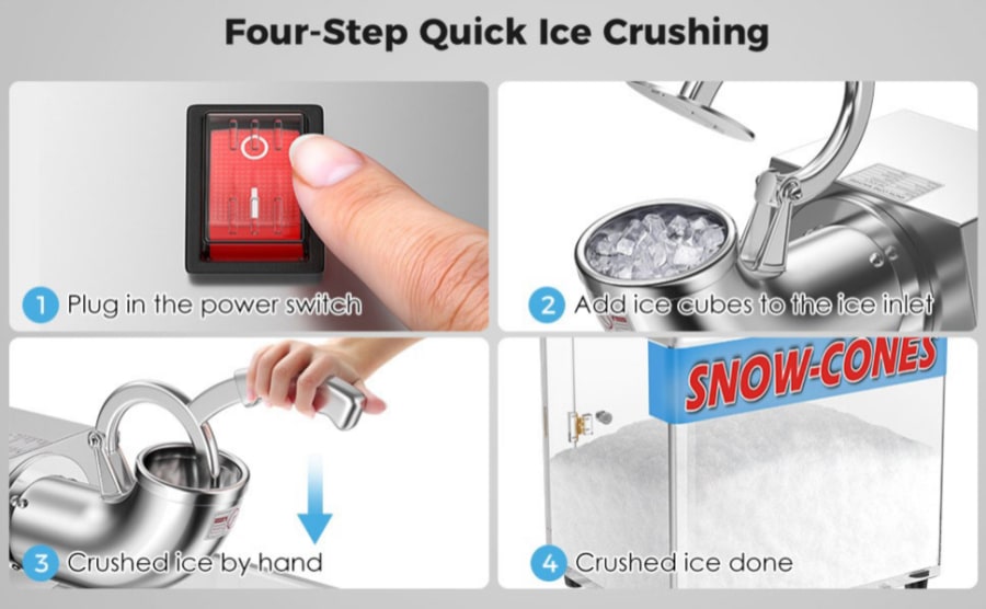 Make your own sno-cones with this easy-to-use sno-cone machine. Syrup and cups available for purchase separately. Ice is not included. This unit is a tabletop machine so please make sure you have a flat raised surface for placement. The machine will need to be plugged in (extension cord provided by North Aurora Party Rental). Machine must be operated by an adult.