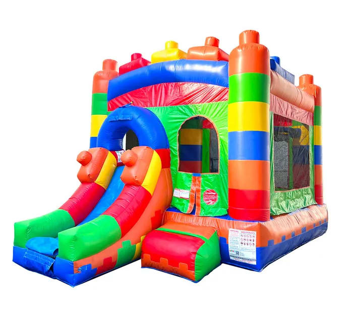 This Lego themed bounce and slide combo also has a basketball hoop inside!