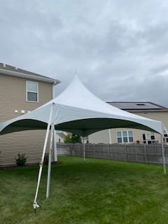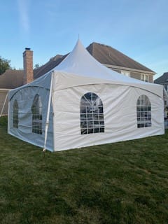 Our High Peak Frame Tent adds a look of elegance to your event. This tent is perfect for weddings, graduation parties, formal dinners and various company events. This tent can seat up to 60 guests with 9 rectangular tables and 60 chairs or up to 40 guests with 4 round tables and 40 chairs.